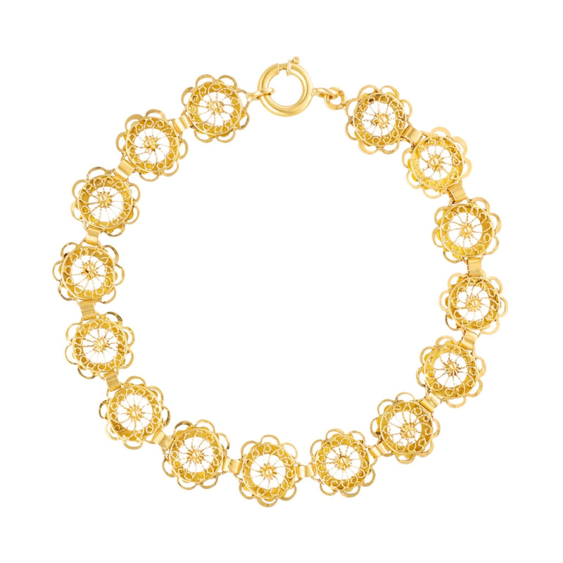 Inspirada en las técnicas clásicas de joyería portuguesa, esta pulsera es perfecta para ocasiones especiales o para realzar tu estilo diario. Su malla floral irradia feminidad y sofisticación, convirtiéndola en una opción encantadora para regalar o como reliquia familiar. Si buscas una joya única con valor artístico y tradición, la Pulsera de Oro con Flores de Filigrana es la pieza ideal.