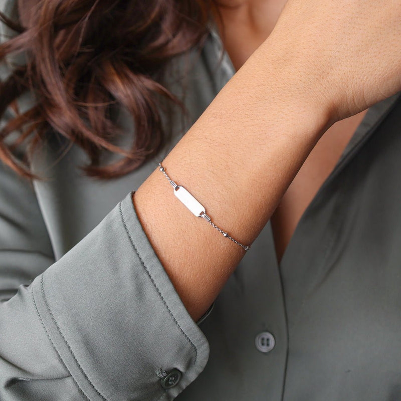 Esta sencilla pulsera de malla de plata blanca con placa y cuentas no solo es atemporal y elegante, sino también muy cómoda. Su diseño flexible se adapta a la muñeca, ofreciendo una sensación suave y agradable.