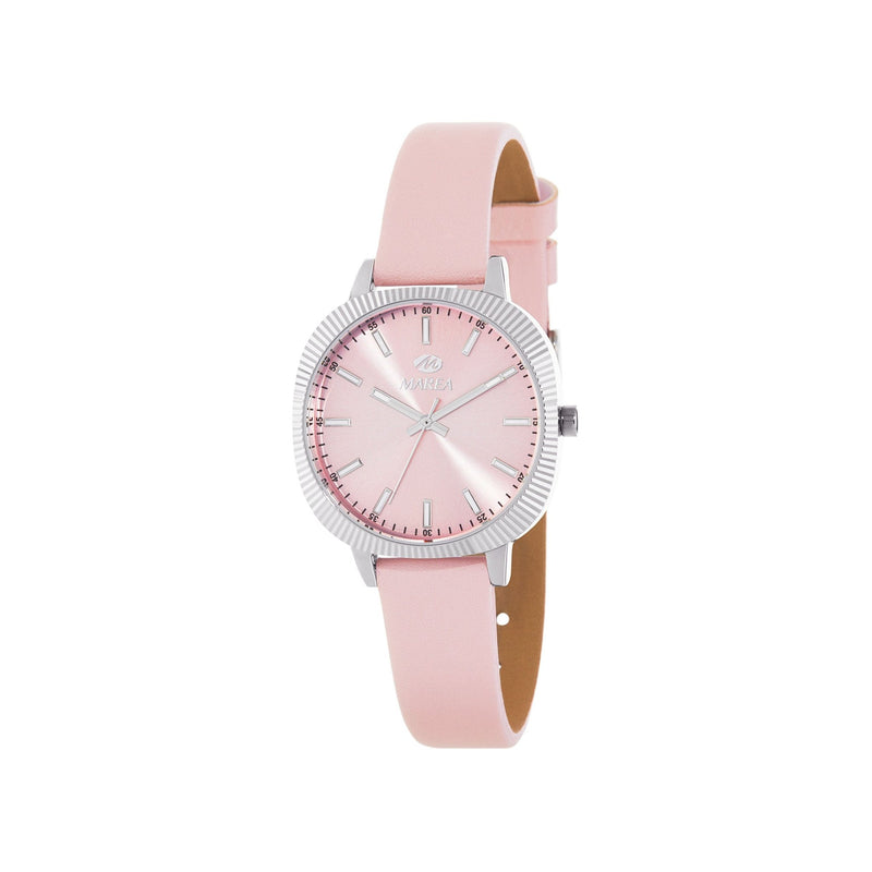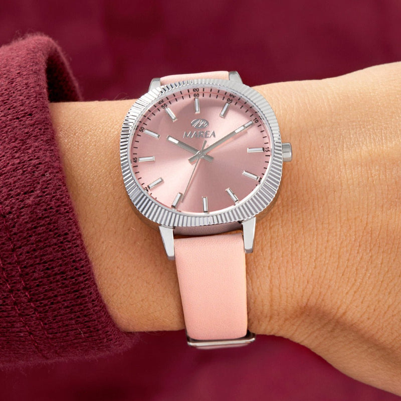 Su correa de piel rosa le confiere un aire romántico y femenino, ideal para el día a día o para ocasiones especiales. El movimiento japonés de tres agujas garantiza precisión y fiabilidad, mientras que su resistencia al agua hasta 3 ATM (30 m) proporciona tranquilidad en el día a día.