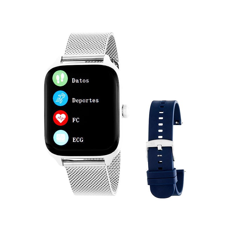 Este reloj presenta un diseño elegante y cómodo con una caja de plástico de 45 x 38 mm y acabado en acero plateado, lo que garantiza ligereza y sofisticación. Su brazalete de malla de acero inoxidable plateado proporciona comodidad y un ajuste seguro con cierre deslizante, y puede cambiarse por una correa de silicona azul marino para un look más deportivo. Su pantalla táctil de 1,9" es nítida y de alta respuesta, ideal para una visualización clara en cualquier entorno.