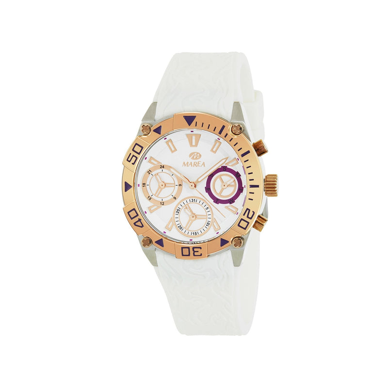 La correa de silicona blanca proporciona una comodidad absoluta y un excelente ajuste en la muñeca, mientras que el movimiento de cuarzo multifunción incluye calendario , cronómetro y 3 manecillas , ofreciendo funcionalidad sin comprometer el estilo.