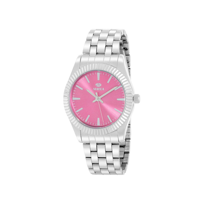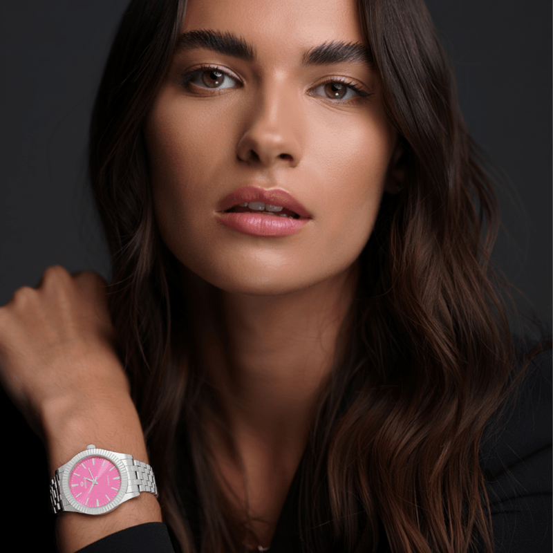 Su pantalla de 38 mm ofrece una presencia imponente en la muñeca, ideal para mujeres que disfrutan de accesorios con personalidad. El brazalete de acero inoxidable combina durabilidad y sofisticación, garantizando comodidad para el uso diario y resistencia al desgaste.