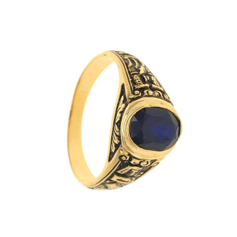 Anel de Curso em Ouro de 19.2kl com Safira Australiana, e aro adornado de motivos náuticos, com acabamento em esmalte preto