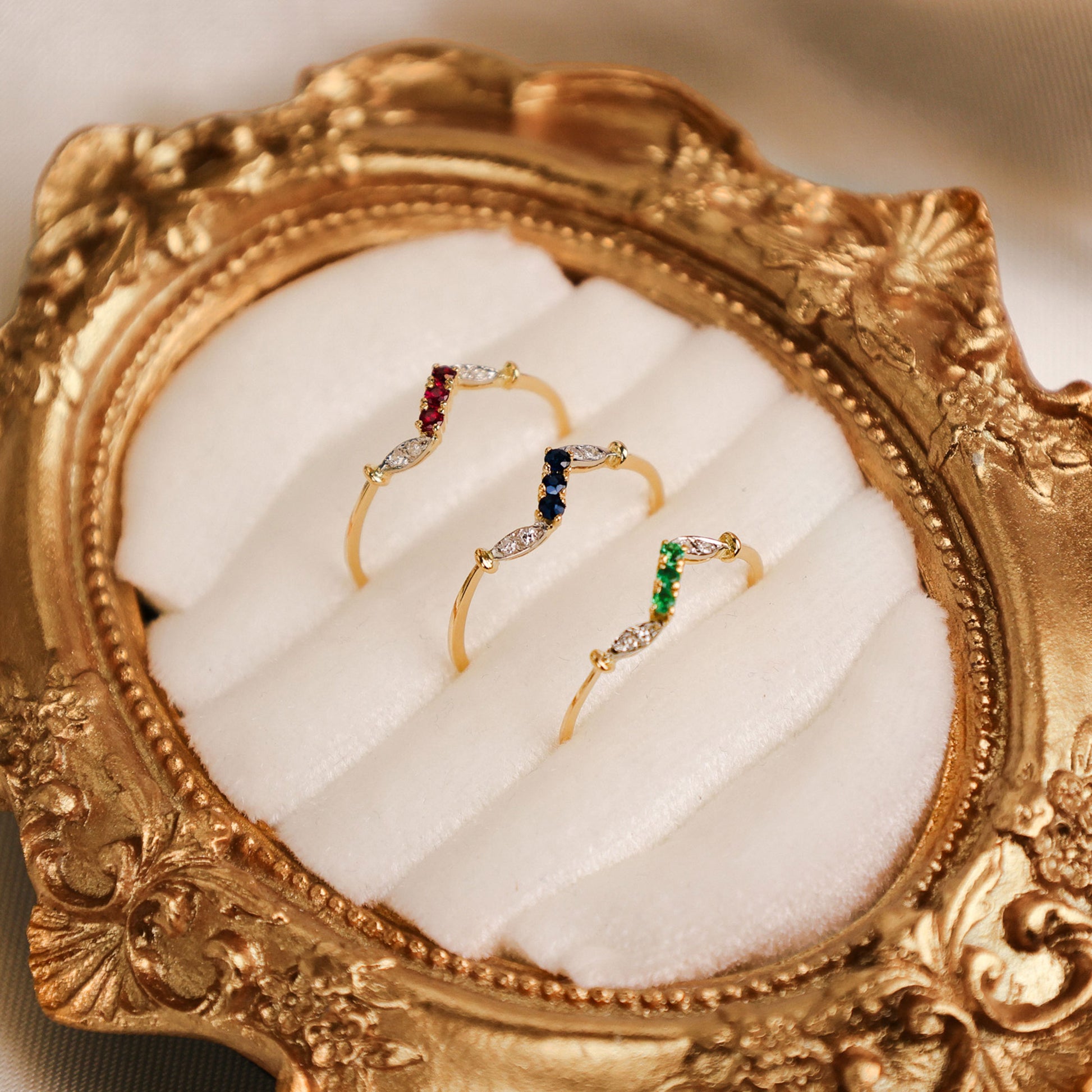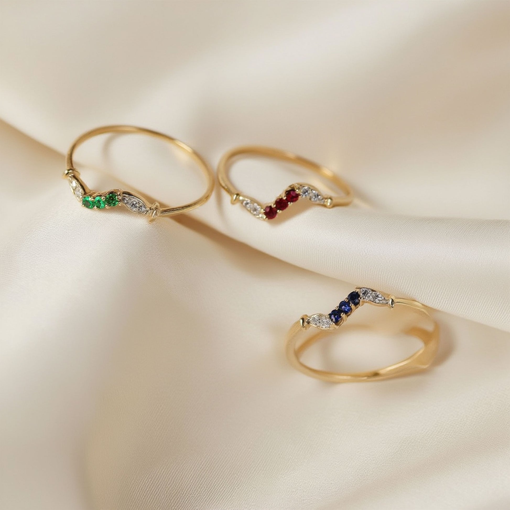 Ao centro, destacam-se topázios azuis de tonalidade intensa, que conferem profundidade e sofisticação à peça. As zircónias brancas laterais acrescentam brilho e contraste, realçando ainda mais a beleza das pedras centrais e criando um efeito harmonioso e luminoso.