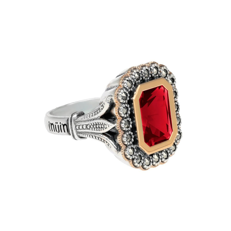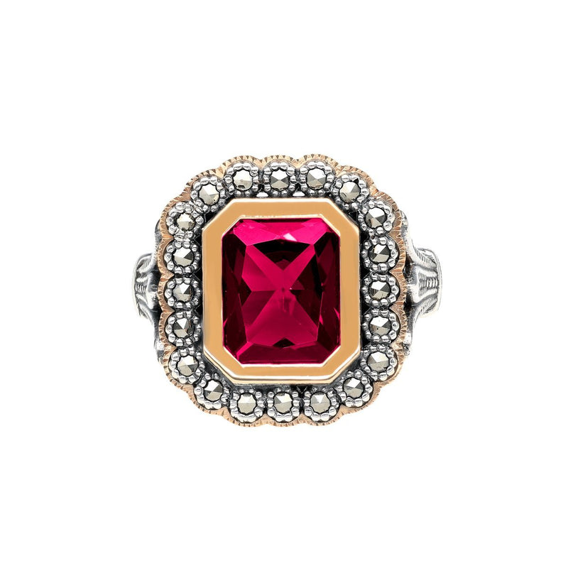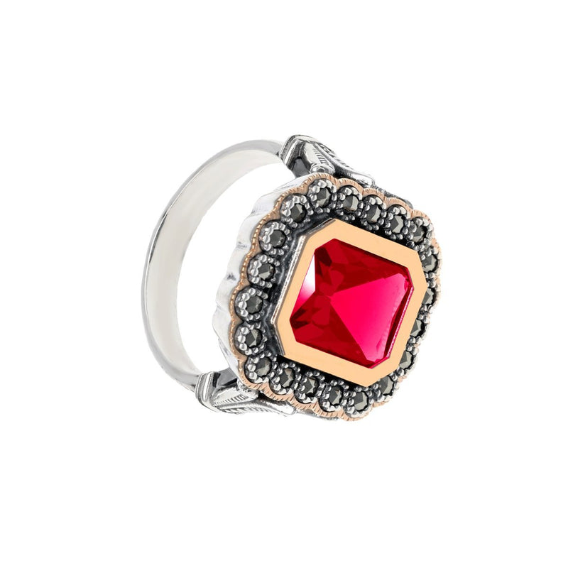 Anel D. Constança em Prata 925 adornado de Pedra Vermelha ladeada por Marcassites e apontamentos em Ouro de 9kl