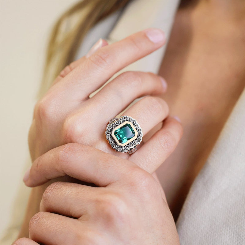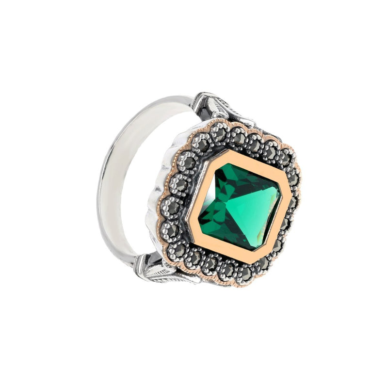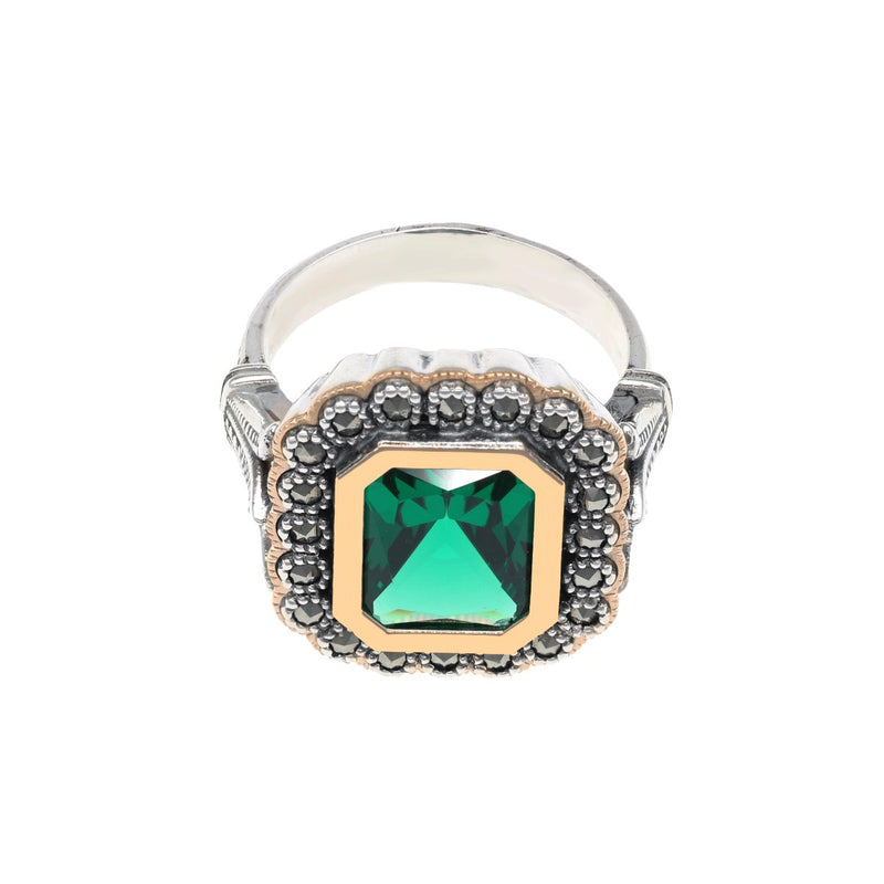 Anel D. Luísa em Prata e Ouro 9kl com Marcassites e Pedra Verde