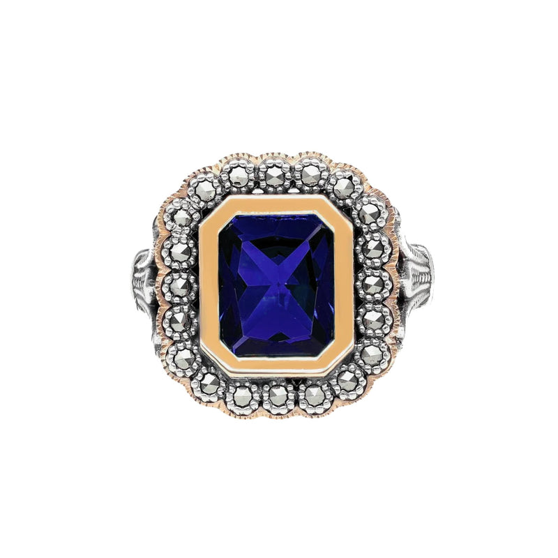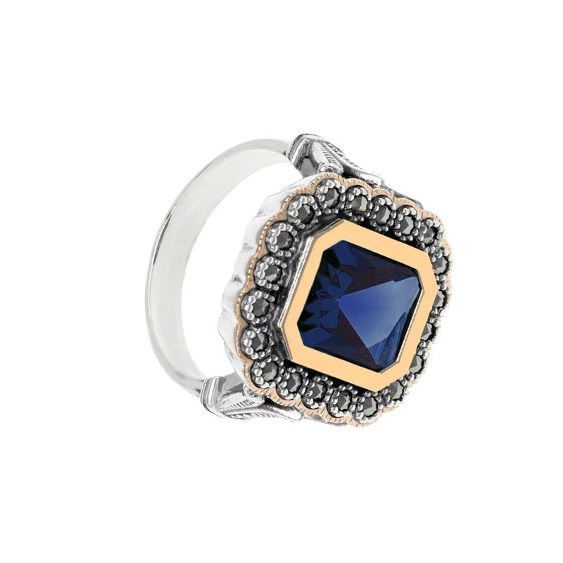 Anel D. Sofia em Prata e Ouro 9kl com Marcassites e Pedra Azul