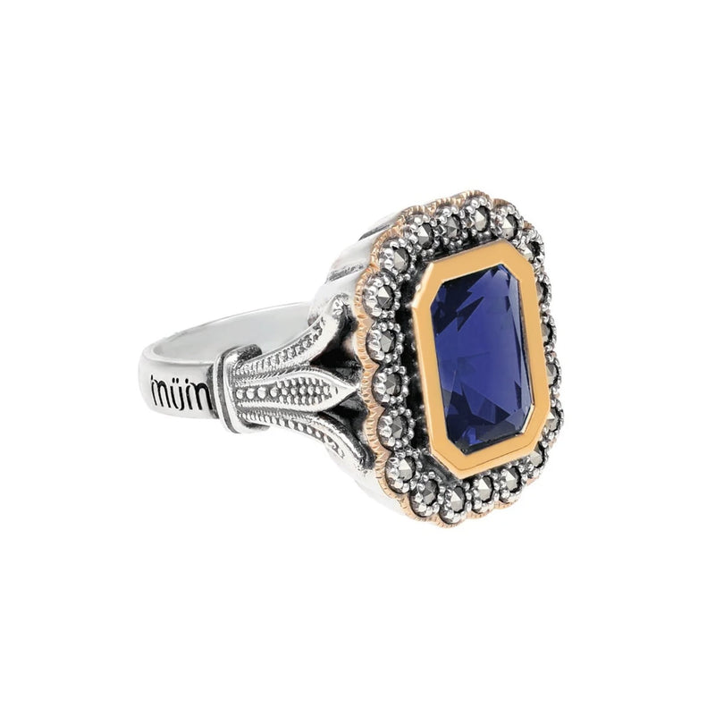 Anel D. Sofia em Prata 925 adornado de Pedra Azul ladeada por Marcassites e apontamentos em Ouro de 9kl