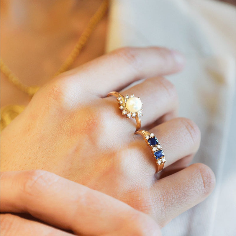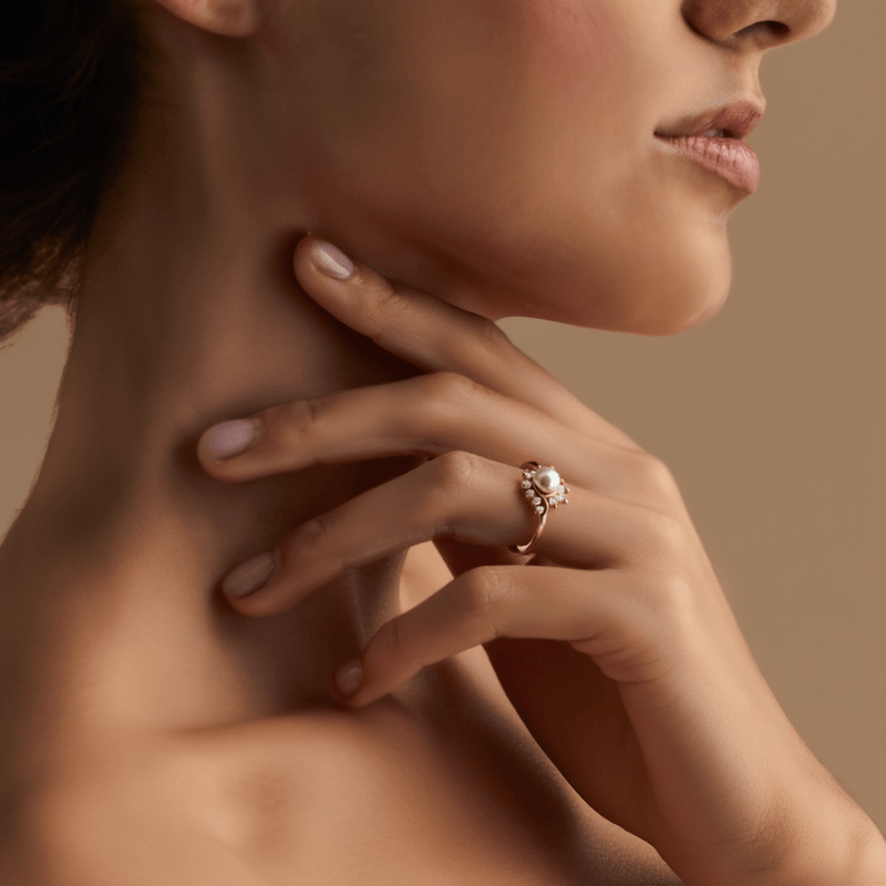 A pérola, símbolo de pureza e beleza atemporal, ocupa o centro do palco. A sua suavidade irradia um brilho suave, enquanto a sua presença delicada adiciona uma nota de refinamento à peça. A pérola é escolhida pela sua perfeição natural e representa a simplicidade e a elegância clássica.
