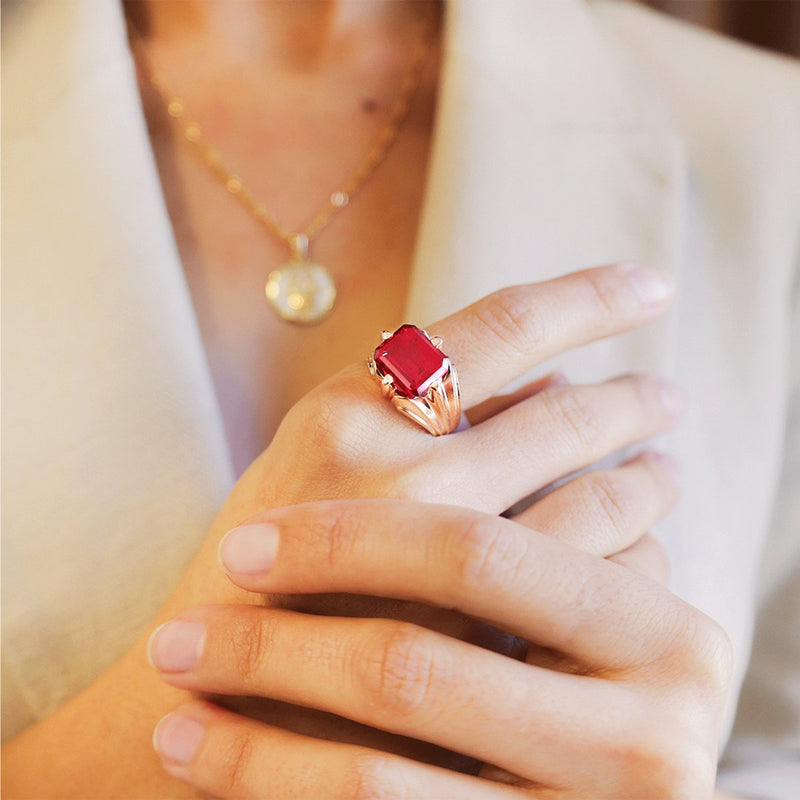 Os detalhes meticulosos da montagem do anel acentuam ainda mais a preciosidade desta peça, proporcionando um equilíbrio perfeito entre o clássico e o contemporâneo. Seja para uma ocasião especial ou como uma expressão diária de sofisticação, este anel em ouro de 19.2 quilates adornado com um magnífico rubi é a escolha definitiva para quem busca uma joia excepcional.