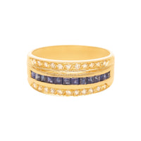 A peça central deste anel é uma fiada de safiras, adicionando uma explosão de cor à joia. A disposição cuidadosa destas pedras preciosas cria um efeito visual deslumbrante, capturando a atenção e emanando uma aura de elegância.