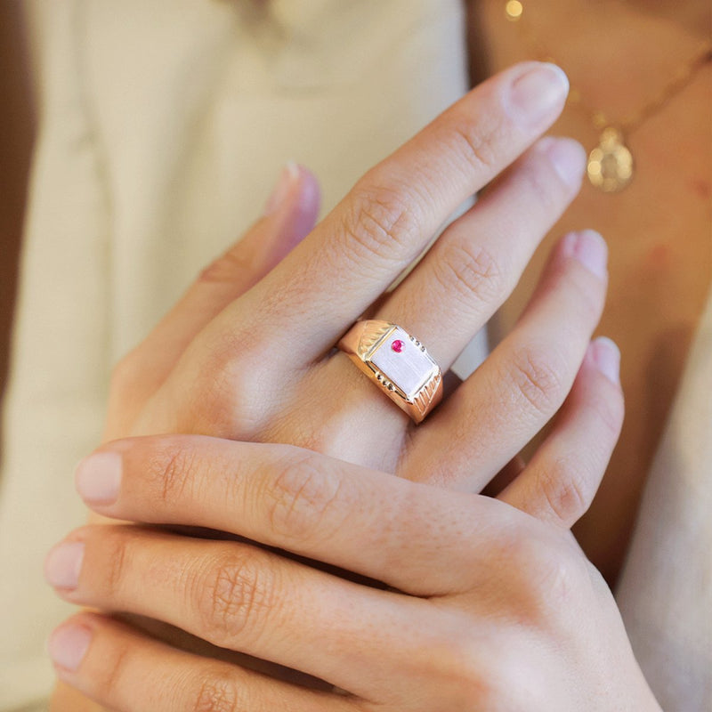 O destaque deste anel é o Rubi, uma pedra preciosa conhecida pela sua cor intensa e beleza vibrante. Cravejado na mesa do anel, o Rubi adiciona um toque de cor e sofisticação à peça. A escolha de um design tipo mesa proporciona uma apresentação destacada do Rubi, permitindo que a pedra seja o foco principal.