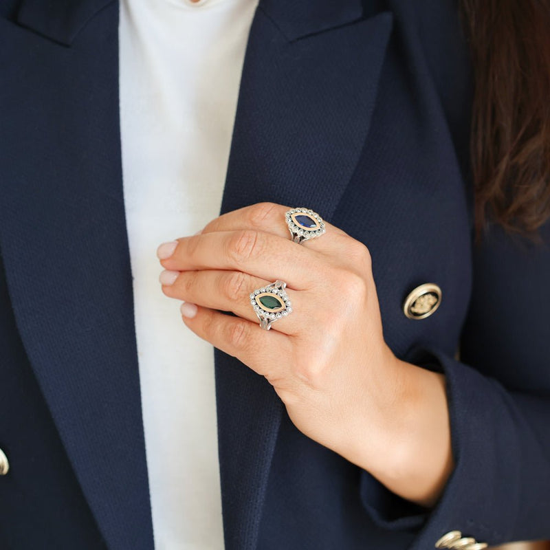 Anel Oval em Prata 925 e Ouro 9kl com Pedra Verde