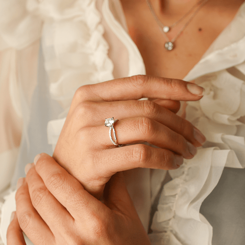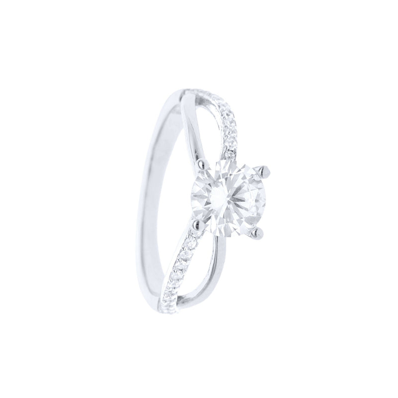 Anel Solitário Anabela em Prata 925 adornado de elegantes zircónias ao redor de uma Zircónia central de 6mm assente em quatro garras