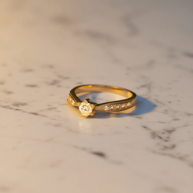 Anel Solitário em Ouro de 19.2kl com adornado de elegante Zircónia acente em seis garras, com aro cravejado de zirconias