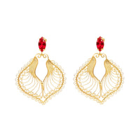 A filigrana dourada adiciona uma dimensão de delicadeza e elegância aos brincos, criando uma aura de luxo sutil. No centro de cada harpa, uma pedra vermelha brilhante é cuidadosamente cravada, adicionando um toque de cor vibrante e paixão ao conjunto.