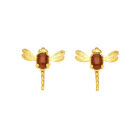 Elegantes brincos em prata dourada com design de libélula, símbolo de transformação, leveza e liberdade. A peça é realçada por uma pedra oval em tom castanho, que acrescenta profundidade e um toque sofisticado ao brilho dourado.