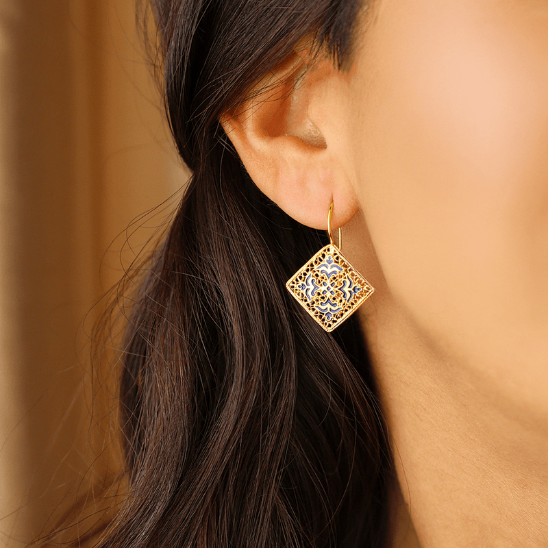 Brincos Segredos do Tejo em Prata Dourada 925 com Esmalte Azul – Inspirados nos Azulejos Portugueses