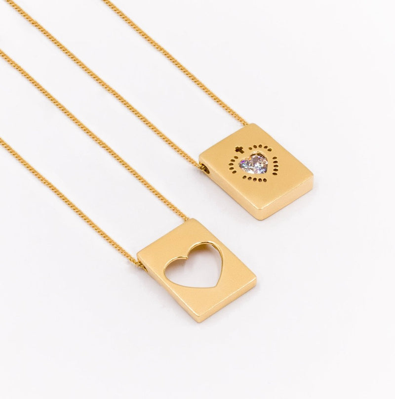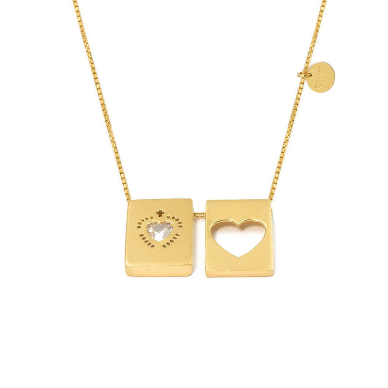 Escapulário em Prata 925, plaqueado a Ouro de 24kl, adornado com Zircão em Forma de Coração