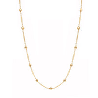 Elegante fio em Ouro de 19 quilates com design delicado e contemporâneo, composto por uma fina corrente intercalada com traves alongadas e esferas polidas. Esta combinação cria um visual equilibrado e dinâmico, onde o brilho das esferas contrasta harmoniosamente com as linhas simples dos travos.