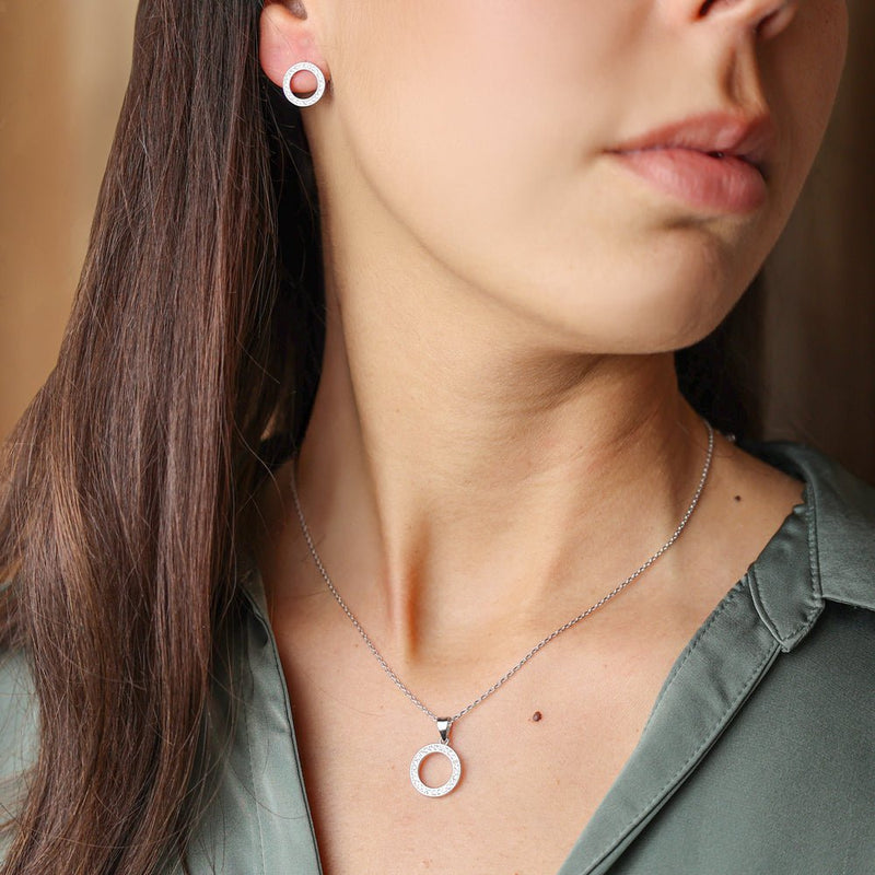 Seja para oferecer a alguém especial ou para complementar sua coleção de joias, este fio com círculo cravejado de zircónias em prata é uma peça intemporal, cheia de charme e significado.