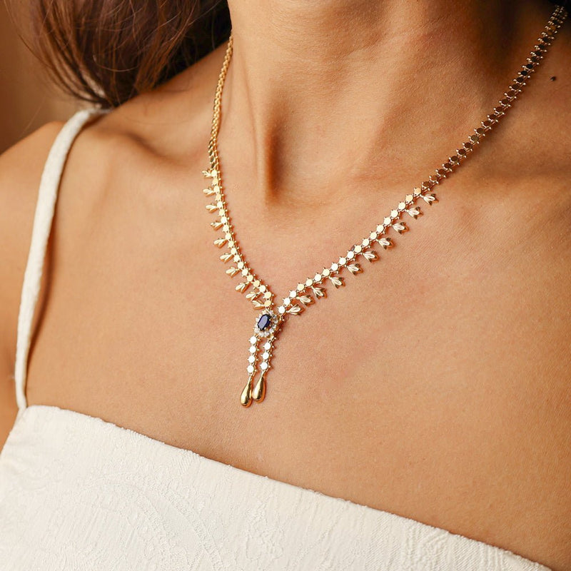Gargantilha de Ouro 19.2kl com Safira, Zircónias e Detalhes Elegantes – Sofisticação Clássica com Design Exclusivo
