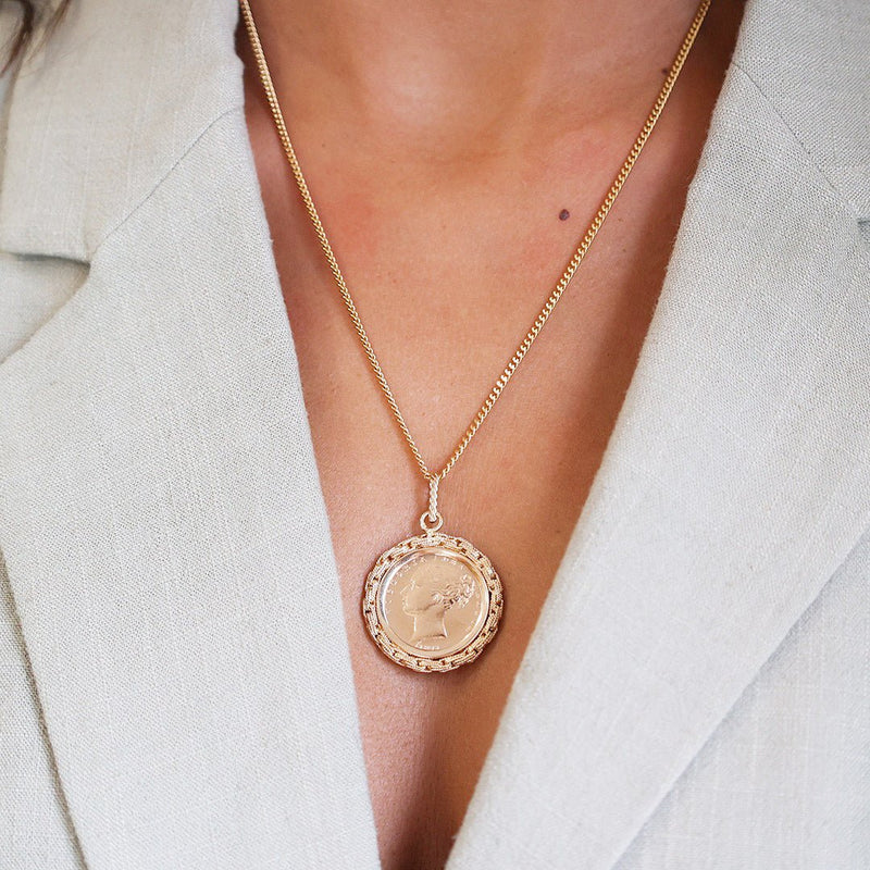 O design clássico da Libra apresenta o perfil da Rainha Victoria no anverso e o Brasão Real no verso, criando uma peça que é simultaneamente uma joia e um fragmento da história. O aro tipo corrente em ouro de 19.2 quilates complementa perfeitamente a moeda, permitindo que seja usada como um magnífico pendente. Esta peça única pode ser facilmente complementada com um fio em ouro à sua escolha, adicionando um toque pessoal à joia.