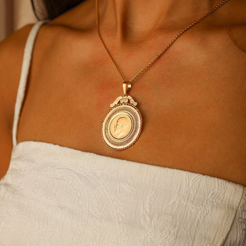 O aro estilo Dola desta libra em ouro 19kl é o que lhe confere um carácter distintivo e imponente. Com um design elaborado em relevo, o aro envolve a moeda com linhas entrelaçadas que remetem à tradição das montagens clássicas e ao valor simbólico de proteção e poder. Este detalhe transforma a libra numa peça não apenas de valor histórico e material, mas também estético, elevando-a a um verdadeiro destaque na arte da joalharia em ouro.