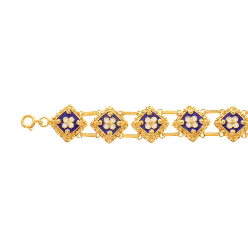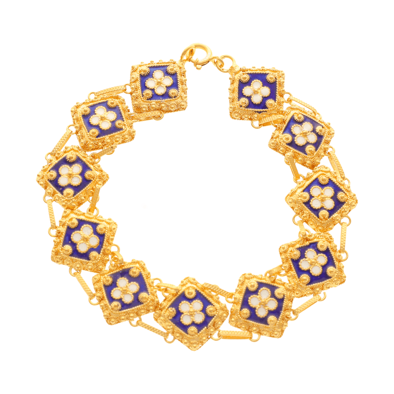 Requinte e elegância. Duas das palavras que melhor descrevem esta pulseira em ouro de 19 quilates. Inspirada na tradição do azulejo português, esta pulseira em ouro faz parte da coleção "Tradição" que junta a arte da filigrana à tradição dos caramujos. Os motivos florais em esmalte branco e azul adicionam ainda um toque de elegância e sofisticação. Se gosta de joias em ouro sofisticadas e intemporais, esta é, sem dúvida, a escolha perfeita.