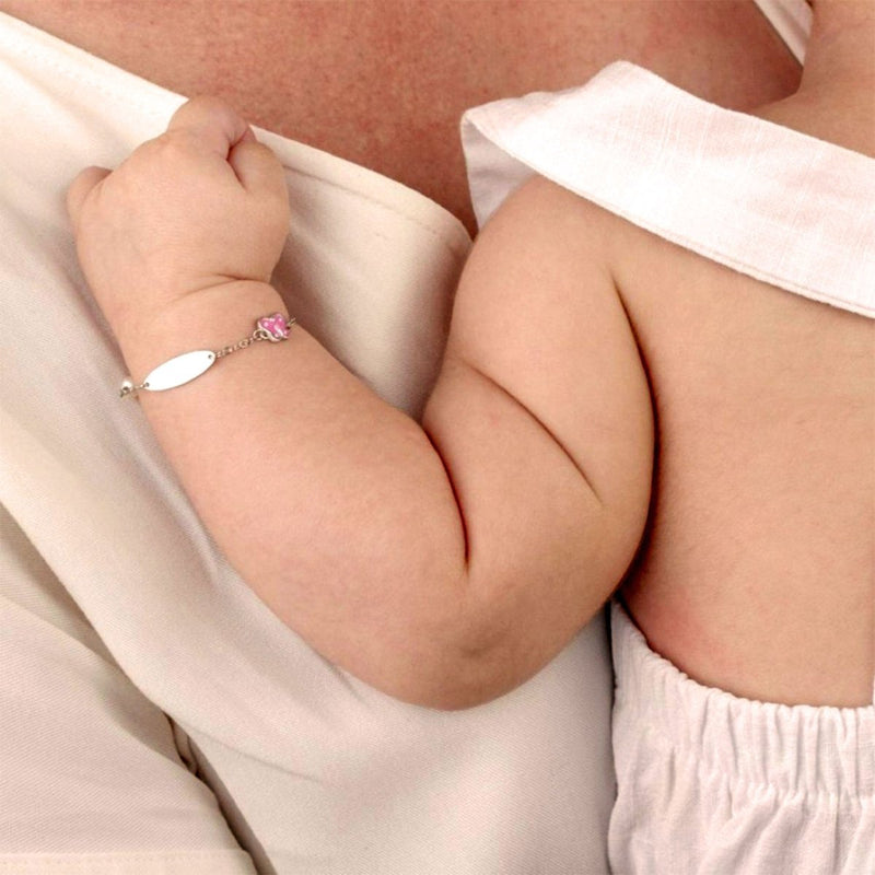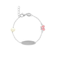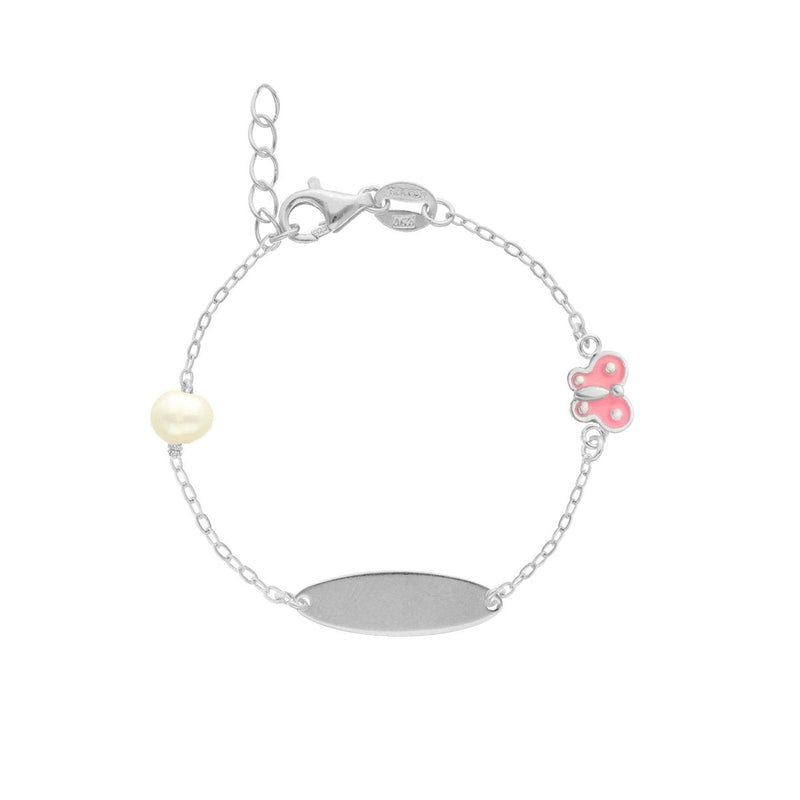 Pulseira em Prata 925 com chapa para gravação, adornada de Borboleta em Esmalte e Pérola. Ideal para bebé ou criança.