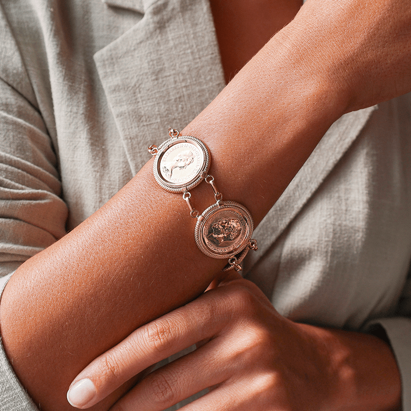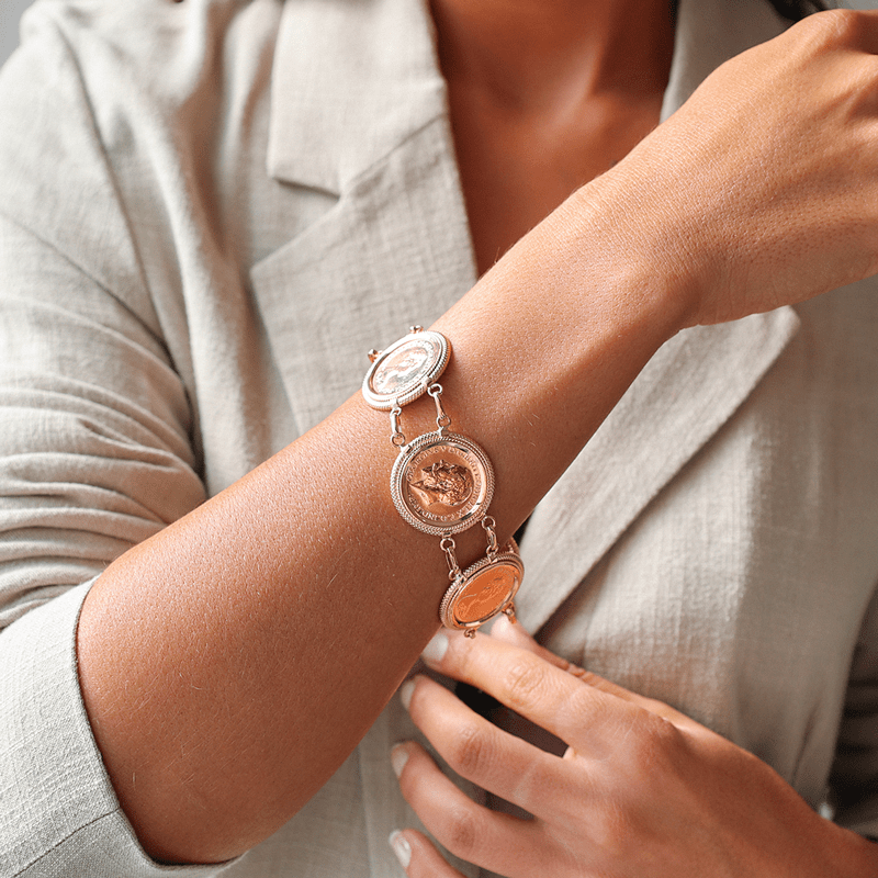 Esta pulseira única combina uma elegante malha pontilhada em Ouro de 19.2 quilates com cinco autênticas Libras em Ouro de 22 quilates, criando uma peça de joalharia extraordinária que une tradição e valor histórico.