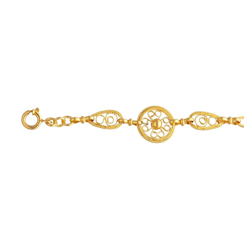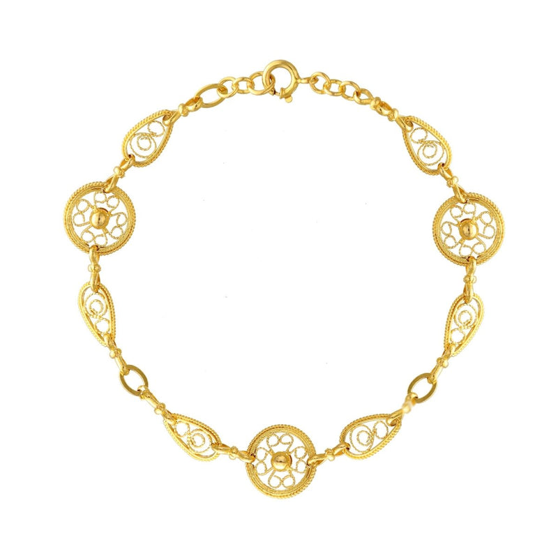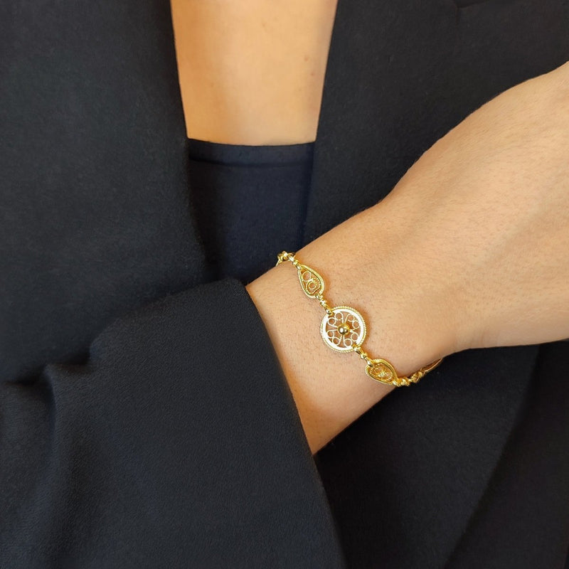 Esta pulseira de ouro é uma verdadeira obra de arte que combina delicadeza e luxo. Perfeita para mulheres que apreciam a arte da ourivesaria, esta é um testemunho do talento artesanal e da beleza intemporal da filigrana. O seu design leve e gracioso adiciona um toque de elegância ao pulso, destacando-se com subtileza em qualquer ocasião.