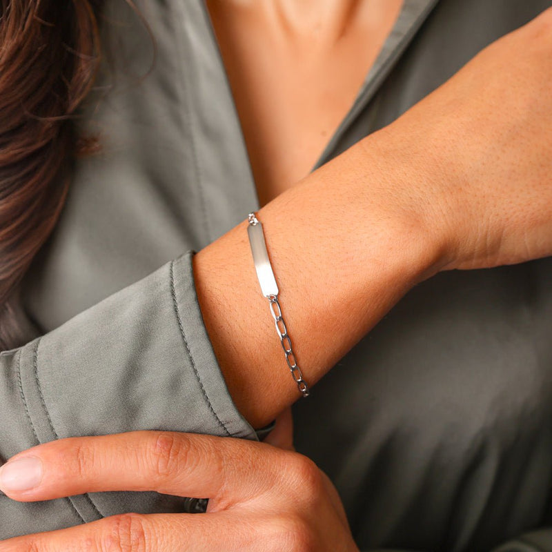 Esta pulseira malha barbela em prata branca com chapa, para além de intemporal e elegante, é também bastante confortável de usar. O seu design flexível adapta-se ao pulso, oferecendo uma sensação suave e agradável.