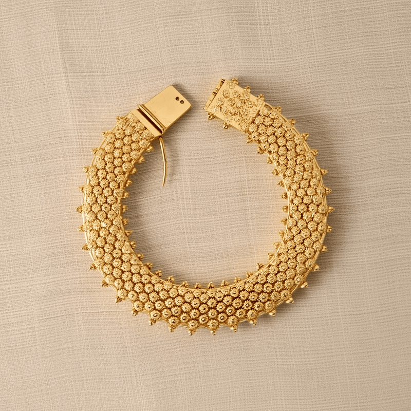 Esta pulseira vintage é mais do que uma simples peça de joalharia; é uma obra de arte que conta histórias e desperta sentimentos de nostalgia e apreciação pelo artesanato tradicional. É uma escolha excepcional para quem procura uma peça de destaque que reflita o seu gosto pela beleza clássica e pela elegância intemporal.