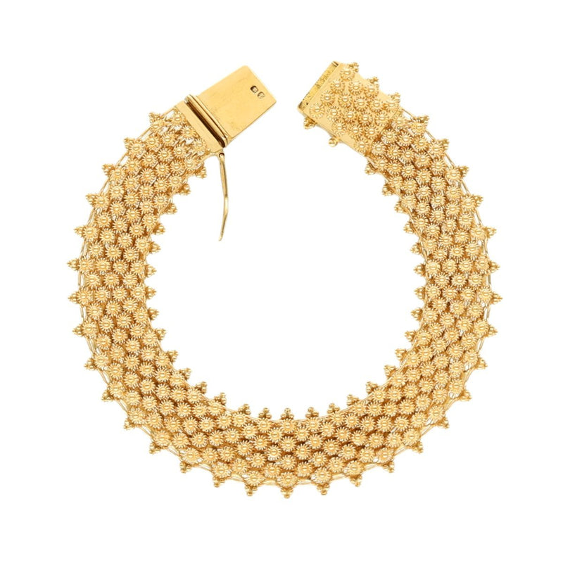 A Pulseira Vintage em Ouro 19,2Kl é uma peça verdadeiramente única e cativante, repleta de detalhes artesanais e charme intemporal. Feita com ouro de alta qualidade, esta pulseira evoca um estilo clássico e distinto que remonta a épocas passadas. A sua bracelete adornada com caramujos meticulosamente trabalhados à mão adiciona uma sensação de autenticidade e nostalgia, enquanto os elegantes granitos ladeiam a pulseira, conferindo-lhe um brilho subtil e refinado.