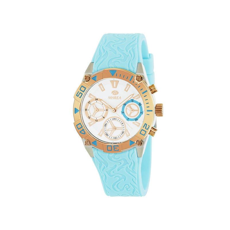 A bracelete em silicone azul confere conforto absoluto e excelente adaptação ao pulso, enquanto o movimento quartzo multifunções inclui calendário, cronómetro e 3 agulhas, oferecendo funcionalidade sem comprometer o estilo.