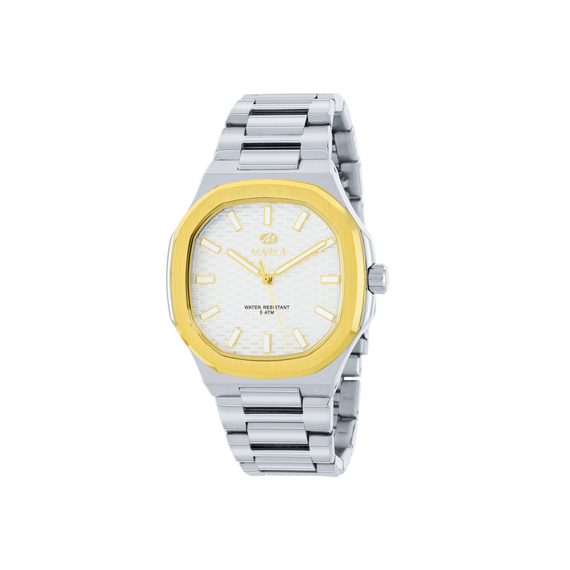Este modelo integra mostrador analógico, movimento quartz confiável e resistência à água até 5 ATM (50 metros) — ideal para uso diário e resistente a salpicos ou chuva leve. A bracelete metálica com elementos bicolores completa o visual com harmonia e versatilidade, adaptando-se bem tanto a looks sociais como casuais.